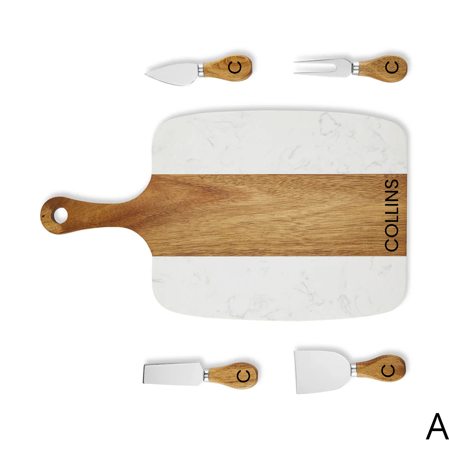 Crafted with premium acacia wood and elegant marble accents.This versatile board includes four serving tools and features a convenient handle for easy use. With its double-sided design, you can cut and serve on one side while displaying your decoration on the other. Wood grain, color, and texture will vary.